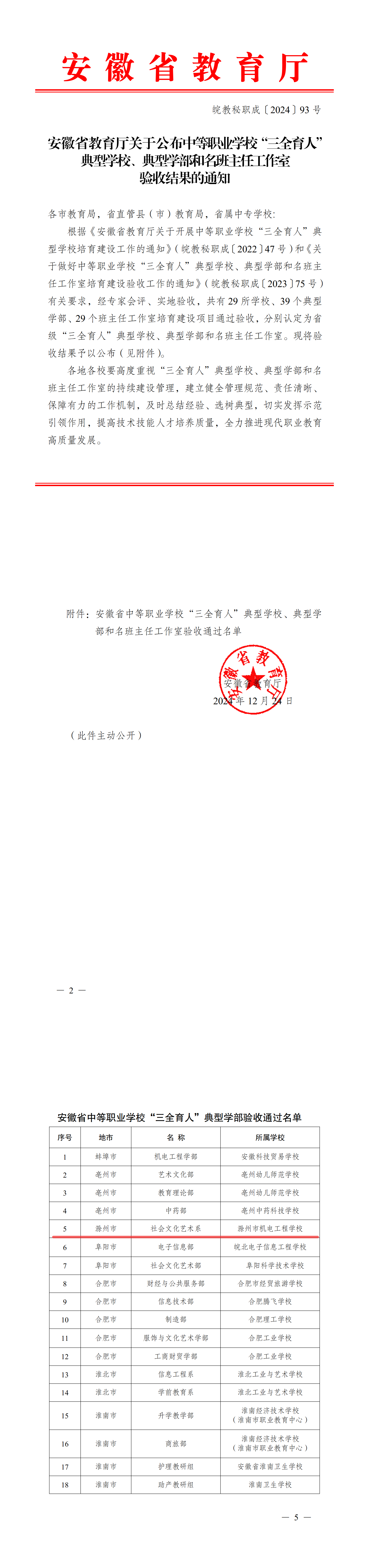 安徽省教育厅关于公布中等职业学校“三全育人”典型学校、典型学部和名班主任工作室验收结果的通知