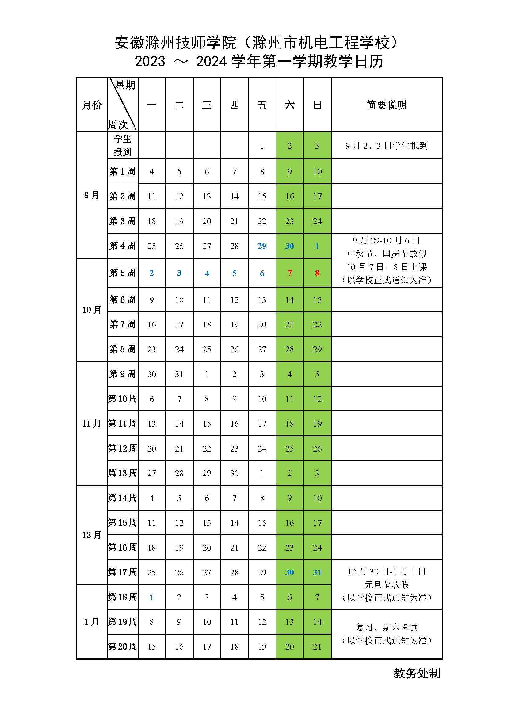 安徽滁州技师学院(滁州市机电工程学校)2023 ~ 2024学年第一学期教学日历 及 9月作息时间表