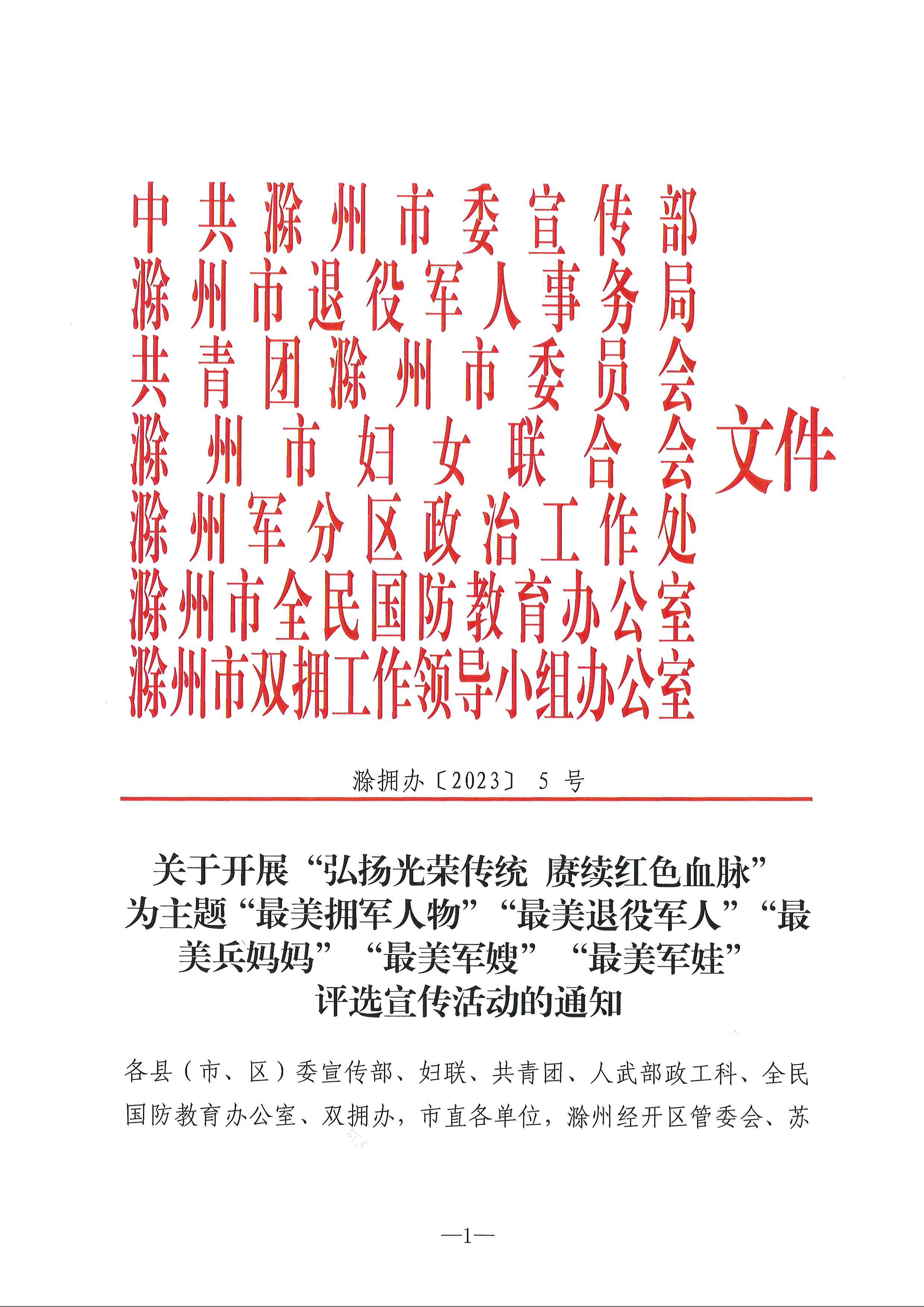 关于开展“弘扬光荣传统 赓续红色血脉” 为主题“最美拥军人物”“最美退役军人”“最美兵妈妈”“最美军嫂”“最美军娃” 评选宣传活动的通知