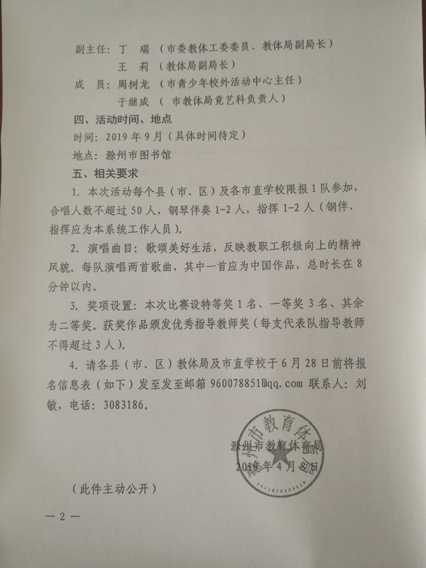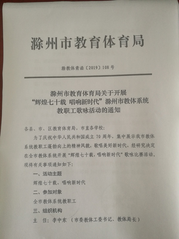 关于开展“辉煌七十载 唱响新时代”滁州市教体系统教职工歌咏活动的通知