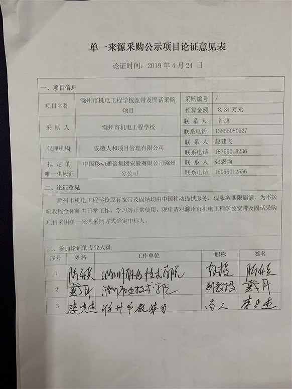 滁州市机电工程学校原有宽带及固话均由中国移动提供服务,现服务期限届满,为不影响我校全体师生日常工作、学习等正常使用,现申请对滁州市机电工程学校宽带及固话采购项目采用单一来源采购方式确定中标人
