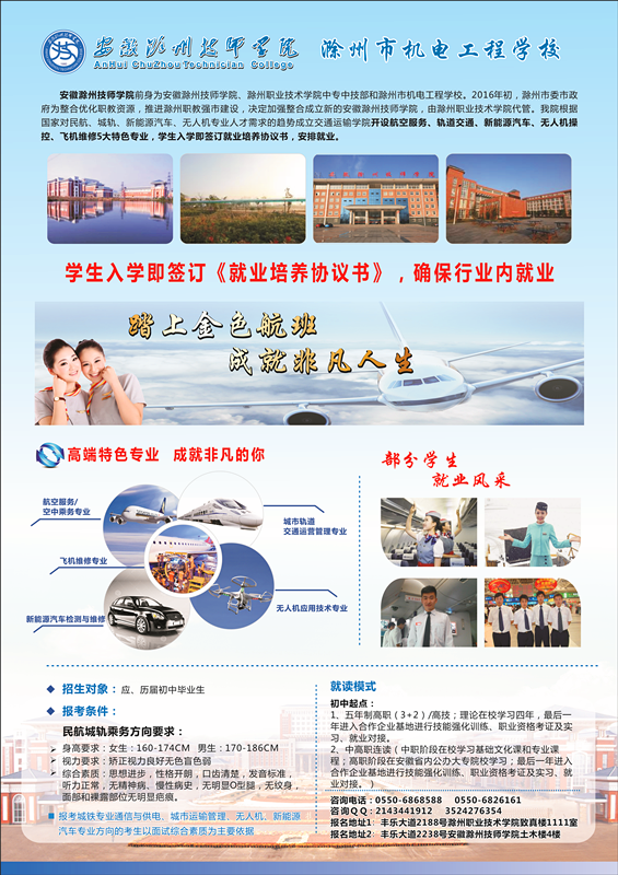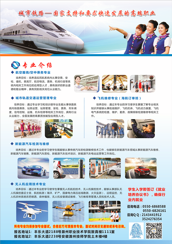 我院根据国家对民航、城轨、新能源汽车、无人机专业人才需求的趋势成立交通运输学院开设航空服务、轨道交通、新能源汽车、无人机操控、飞机维修5大特色专业,定向培养,安排就业。