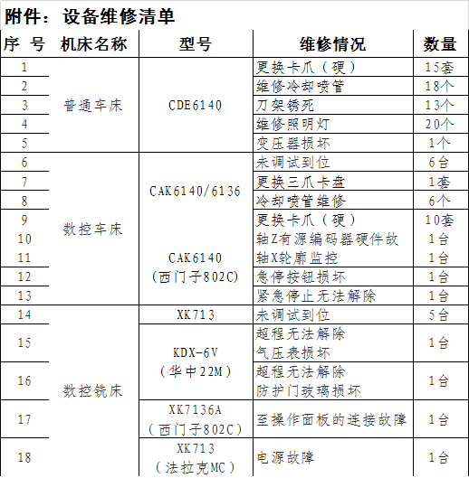 根据我校机械加工专业学生实训需要,现需对设备进行维修,具体见附件,请有意者请到学校现场查看设备,并于一周内向学校报价,截止日期:2013年11月27日(信件报价以邮寄日期为准,报价时请电话告知),学校将组织总务、实训、纪检监察、机械加工实训中心等部门人员公开拆封信件,决定维修单位,并在校园网上公示。 联系人:许老师 联系电话:0550-3016762 联系地址:滁州市丰乐大道2238号(滁州市机电工程学校) 邮编:239000