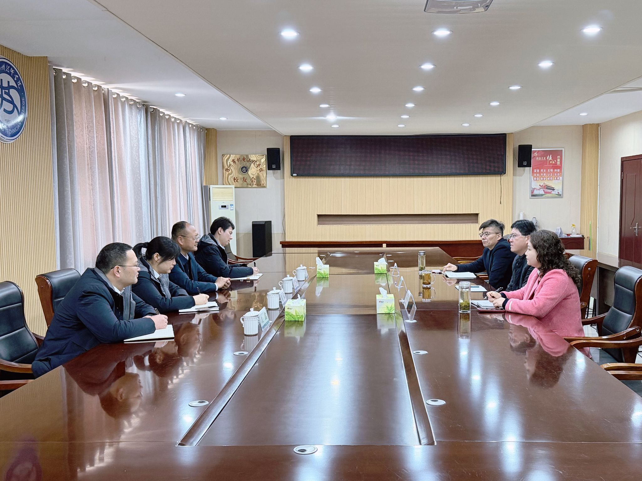 2026年3月19日,滁州皖东农商银行董事长贾信相一行莅临我校开展调研座谈,校党委书记陈通、党委委员、副校长施亮和财务处处长秦静参加了座谈。双方就银校合作、金融宣传等事宜展开了深入的交流。