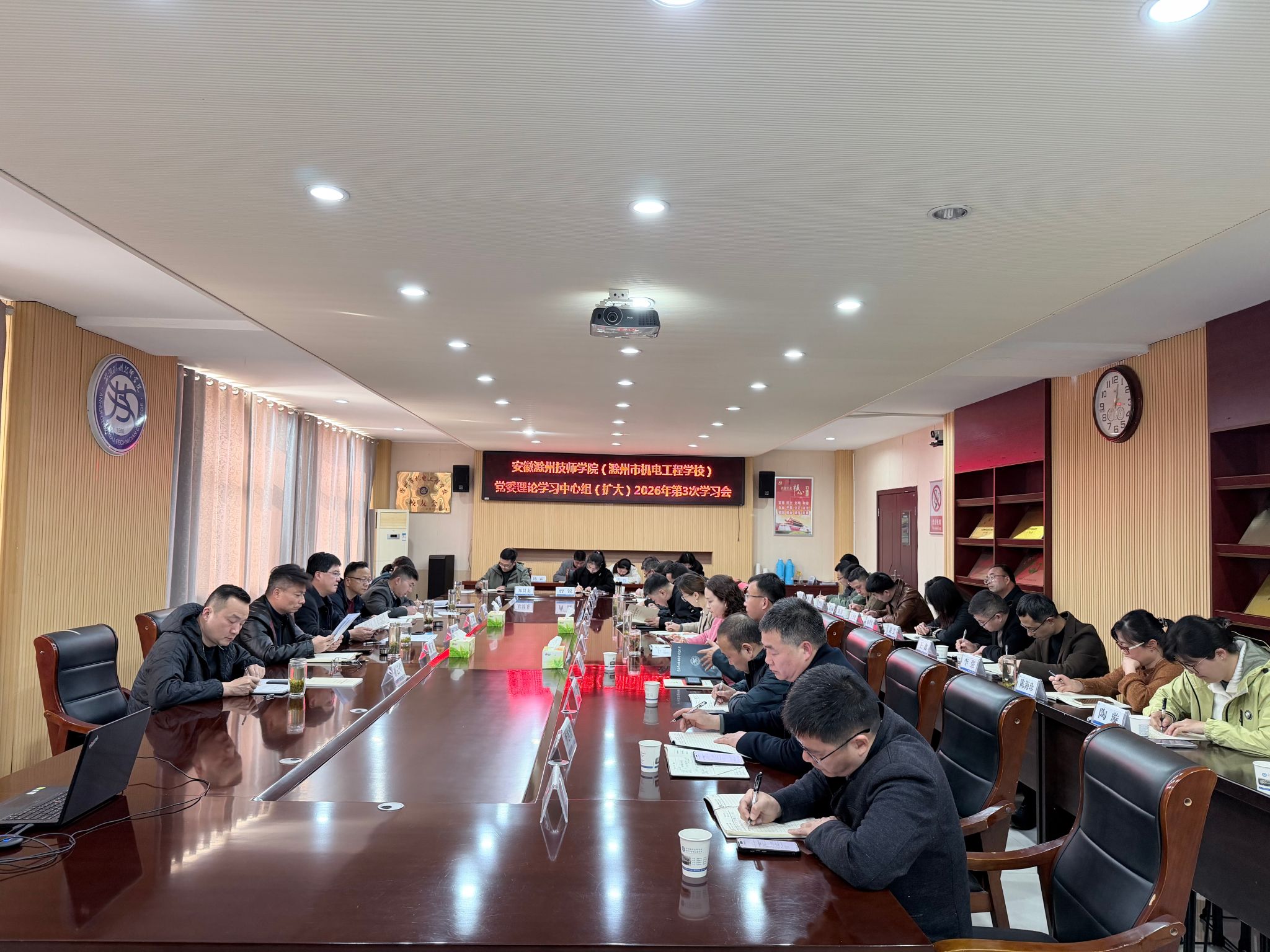 会议集中学习了习近平关于树立和践行正确政绩观论述摘编、习近平总书记地方工作期间坚持正确政绩观生动实践、《求是》杂志重要文章《让愿担当、敢担当、善担当蔚然成风》以及2026年全国两会精神;深入解读教育部关于深化职业教育教学关键要素改革的意见,以及安徽省人民政府《深入推进高素质技能人才队伍建设若干措施》等文件。围绕习近平法治思想重要指示精神,班子成员结合工作实际,进行了交流研讨。会后,与会人员集体观看警示教育片《张敬华案:既想当官又想发财“同学会”上权钱交易》,进行了生动的警示教育。