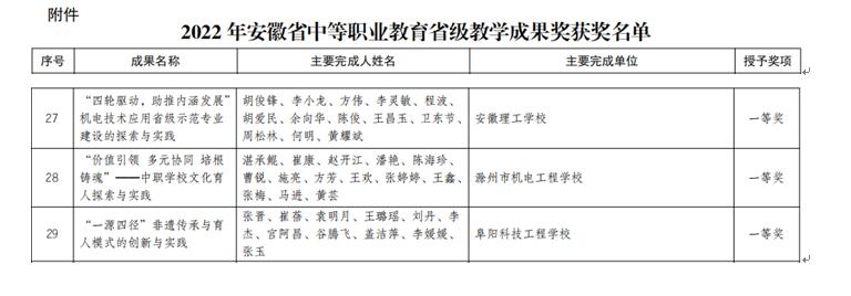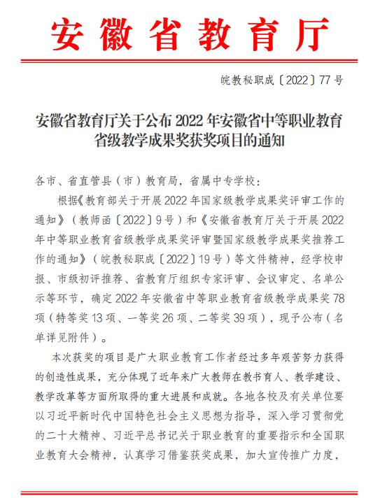 近日,安徽省教育厅发布了《关于公布2022年安徽省中等职业教育省级教学成果获奖项目的通知》(皖教秘职成〔2022〕77号),我校申报的《“价值引领 多元协同 培根铸魂”——中职学校文化育人探索与实践》喜获省一等奖。