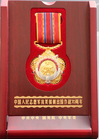 纪念章核心部分为志愿军战士形象和70束光芒,以和平鸽、水纹和中朝两国国旗元素编制的绶带环绕四周,外围采用五星、桂叶和象征五次战役的箭头等元素,组成金达莱花的五瓣造型,象征中国人民志愿军抗美援朝出国作战70周年,寓意伟大的抗美援朝战争是保卫和平、反抗侵略的正义之战,伟大的抗美援朝精神永远是中国人民的宝贵财富,彰显了我国不畏强敌、维护世界和平、构建人类命运共同体的坚定决心和信心。