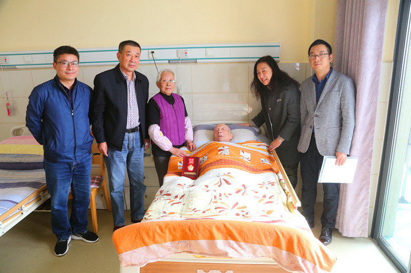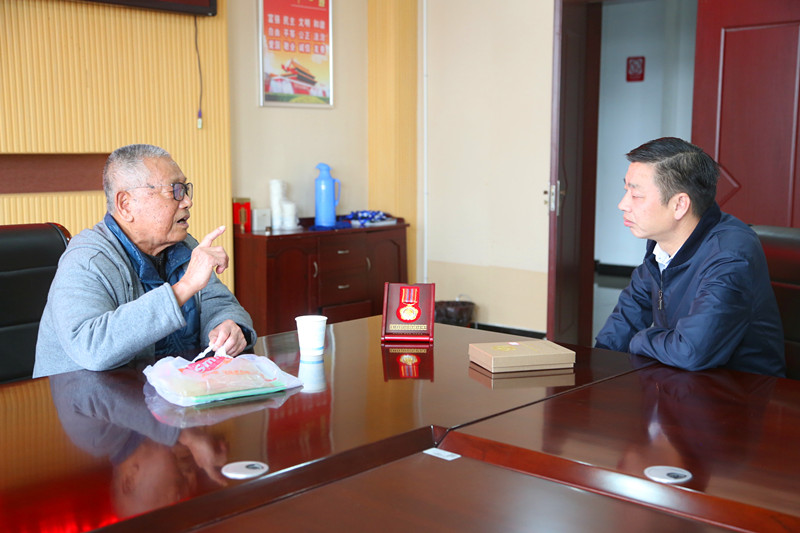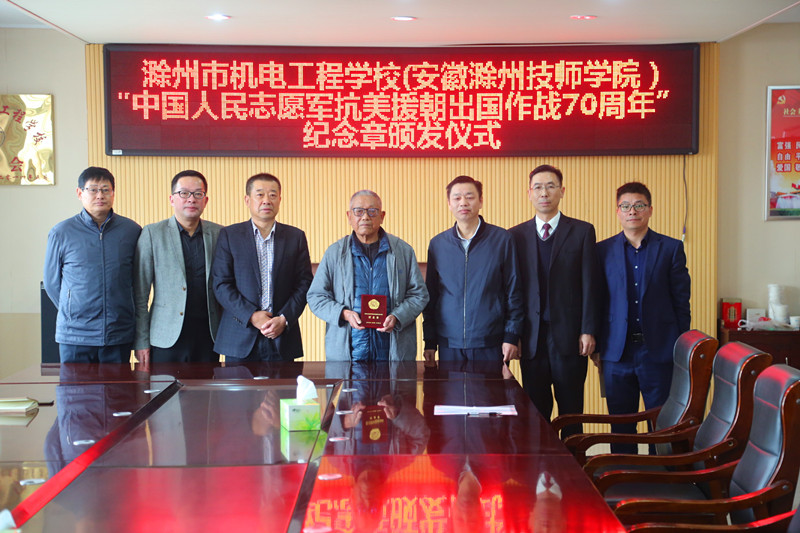 校领导班子成员与他们追忆烽火岁月后,汪上代表校党委表示,奖章是由中共中央、国务院、中央军委为参加抗美援朝出国作战仍健在的志愿军老战士特别制作,体现了党和国家一直以来对志愿军群体的关怀、关爱。这枚沉甸甸的奖章,既是志愿军老兵个人的骄傲,也是学校大家庭的荣光。我们将继续传承和弘扬伟大的“抗美援朝”精神,不忘初心、牢记使命,履行好我们的职责和义务。并代表滁州市机电工程学校(安徽滁州技师学院)全体师生祝愿两位老战士阖家幸福、健康长寿。
