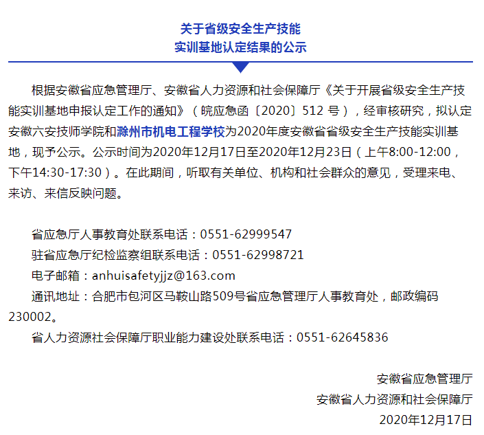 12月8日,学校技能培训与鉴定中心向滁州市应急管理局提交申报安徽省省级安全生产技能实训基地的申请材料,得到批准后,9日向安徽省应急管理厅邮箱提交申请材料,13日省级专家组到校考核,24日成功获评2020年度安徽省省级安全生产技能实训基地。