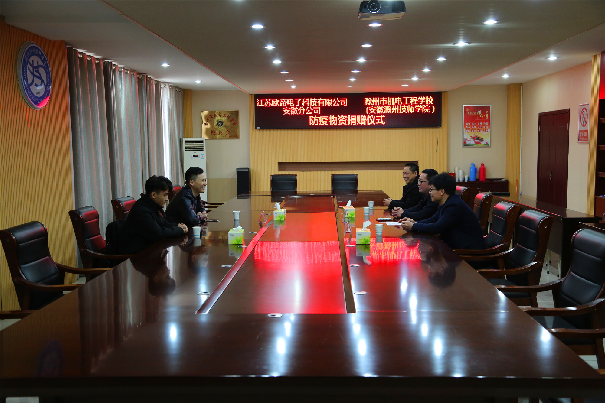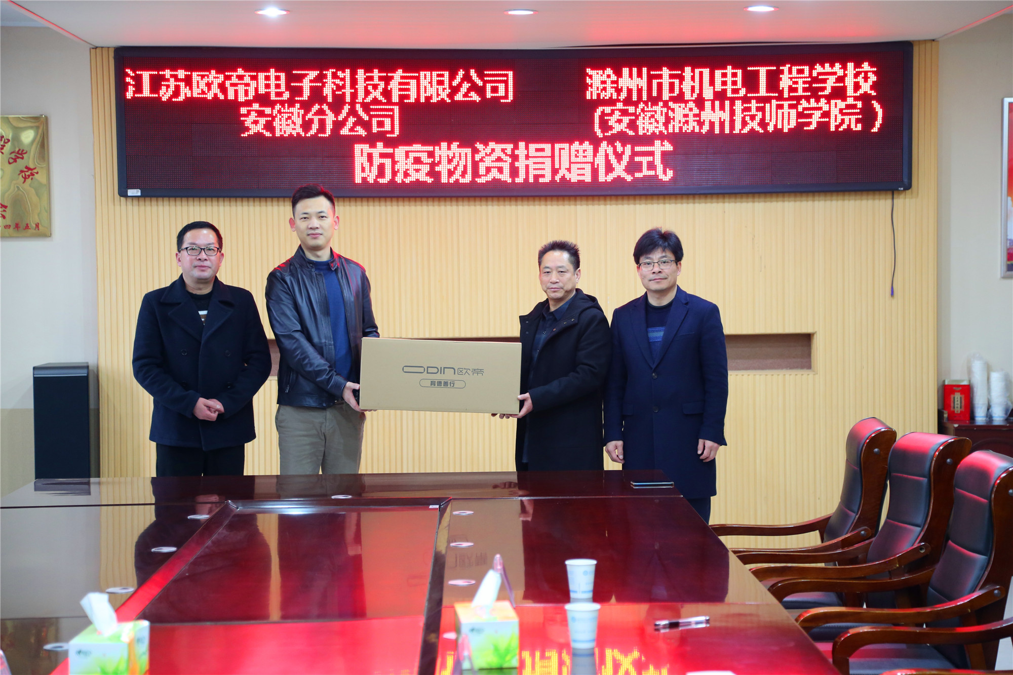 江苏欧帝电子科技有限公司安徽分公司负责人王挺向我校捐赠KN95口罩10000只。仪式上党委委员、副校长湛承鲲、办公室主任施亮、总务处处长范铭祥代表学校接受了捐赠物资。