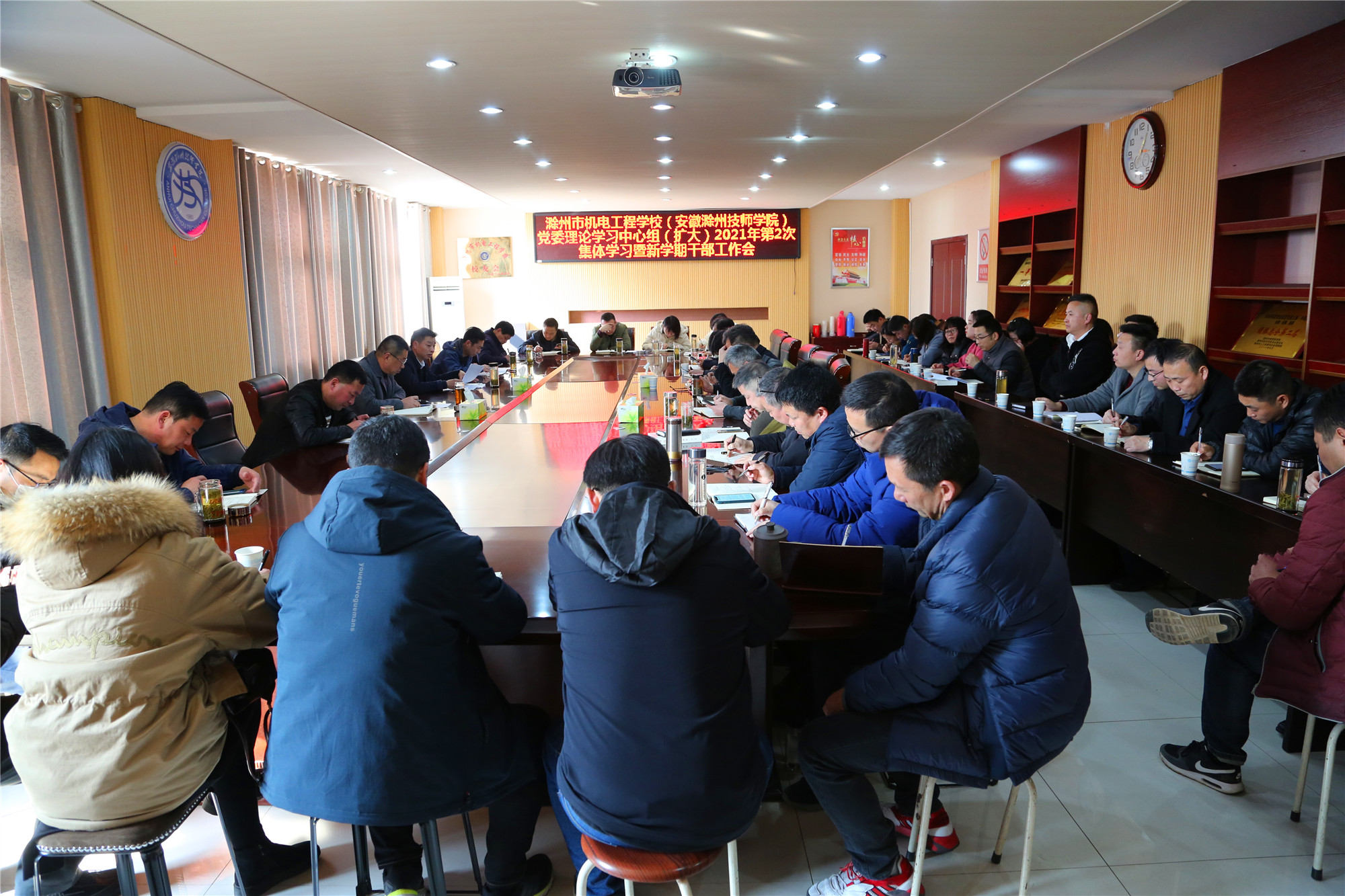 2月24日下午,学校党委书记、校长汪上主持召开学校党委理论学习中心组(扩大)2021年第2次集体学习暨新学期干部工作会议,深入学习了习近平2021年春节团拜会上的讲话、习近平在中共中央政治局第二十七次集体学习讲话精神、习近平在党史学习教育动员大会上讲话精神,传达了2021年安徽省人代会会议精神、2021年滁州市人代会会议精神并部署了新学期开学有关工作。学校党政领导班子成员,各党支部、各部门主要负责同志及副职,各系部教学秘书、学管秘书及团总支书记和思政课教研室教师等人员参加了集体学习。
