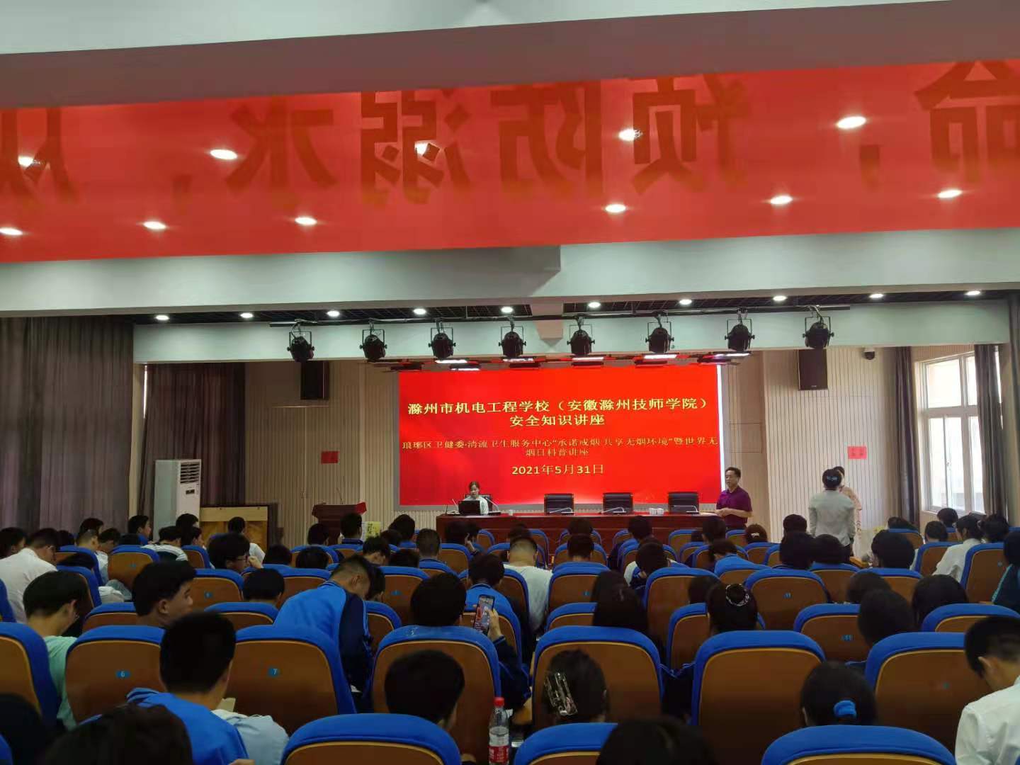 为贯彻落实《“文明滁州 有我更美”暨 2021年市民文明素质提升行动方案》, 在5月31日第34个世界无烟日来临之际,学校邀请滁州市清流卫生服务中心公卫科专家陈主任来校进行安全知识讲座。校总务处负责人范铭祥、石中山、团委副书记王欢及160名学干代表参加了宣教活动。
