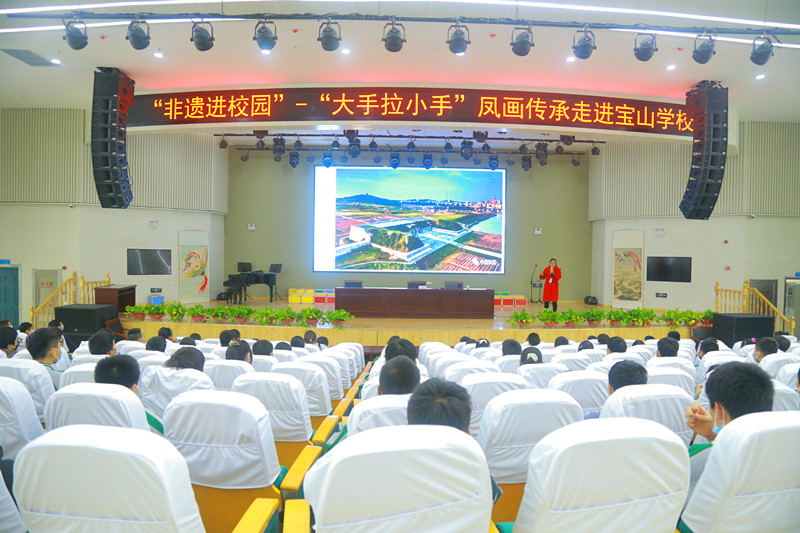 省非物质文化遗产名录项目凤画市级代表性传承人、省“江淮名匠”陈海珍,县级代表性传承人、凤画研究会副秘书长马立敏、凤画传承教师方春燕和凤画社团志愿者走进宝山学校,受到宝山学校的热情接待,副校长徐进、宝山学校一年级和七年级同学们参加了本次活动。