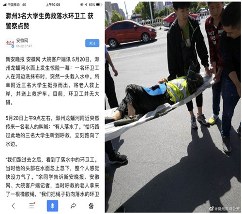 5月20日,滁州龙蟠河水面上发生惊险一幕:一名环卫工人在河边洗抹布时,突然一头栽入水中。所幸途径附近的我系三名2017级高工程造价班同学听见呼救声挺身而出,将老人救上岸,并送上救护车。目前,环卫工并无大碍。