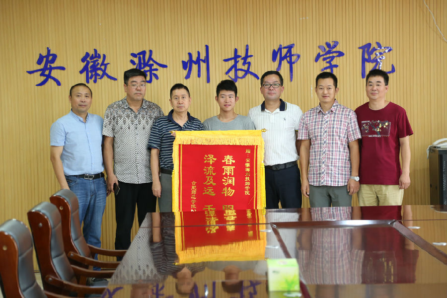 9月5日上午,我校经贸与信息工程系2015级五年制计算机班(合肥师范学院2019级新生)贺君超同学给学校送来锦旗,“春雨润物,明德育才;泽流及远,千里思源”,用这种形式来表达对学校、对老师的感激之情。我校党委委员、副校长湛承鲲及实训中心负责人、经贸与信息工程系负责人、班主任、指导教师参加了赠送锦旗仪式。