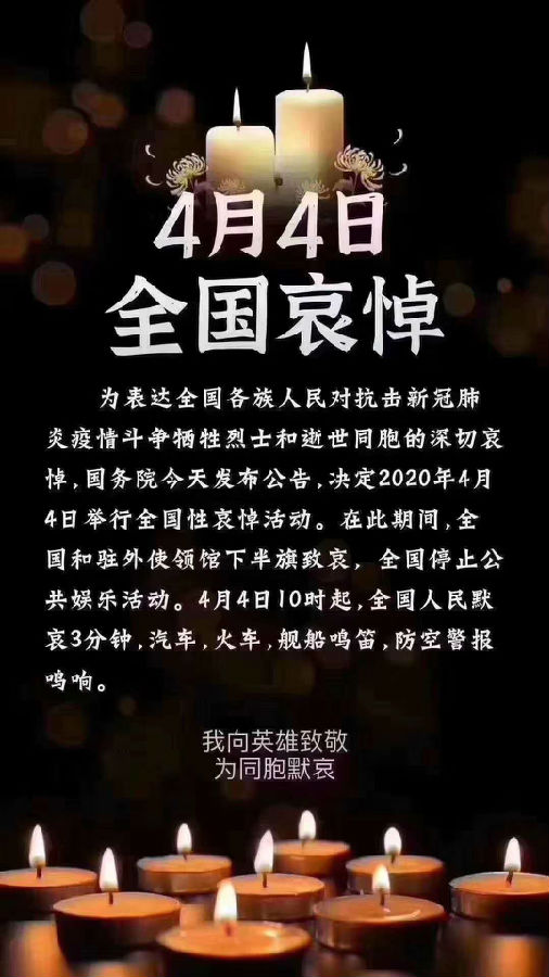 国旗半垂,举国同悲。4月4日,庚子年清明节,全国各地各族人民深切悼念抗击新冠肺炎疫情斗争牺牲烈士和逝世同胞。