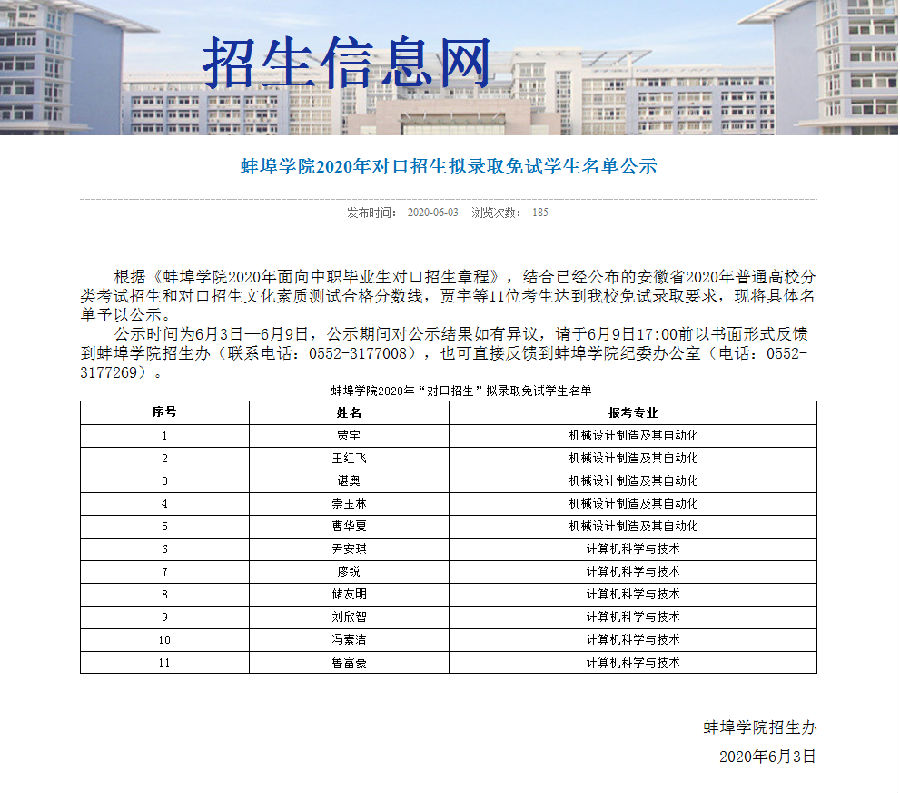 6月3日,从蚌埠学院招生网获悉,我校技能大赛获奖学生冯素洁、尹安琪同学被该校计算机科学技术专业本科拟录取。