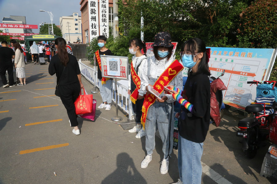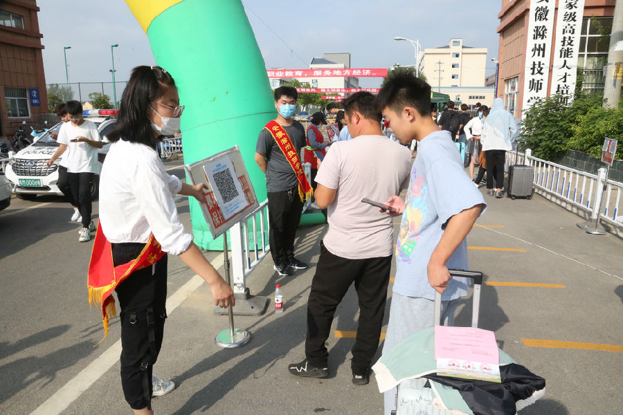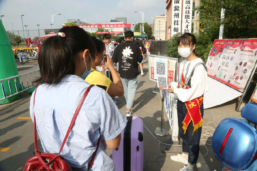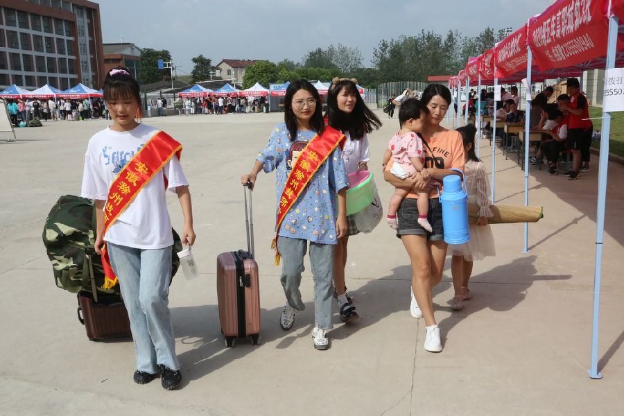 早上7点,志愿者们准时集合,随后分流到各个岗位进行待命,他们顶着炎炎烈日,戴着小红帽,披着红色授带,面含微笑,迎接新生们的到来。学校大门口,志愿者有序列队,协助做好车辆停放、扫码入校等工作;信息咨询处的志愿者详细指引报到地点、解答各类疑问;教学楼门口、交叉路口、中心广场等地方都有引导志愿者驻扎,随时为有需要的新生和家长介绍流程、指引方向、搬运行李。