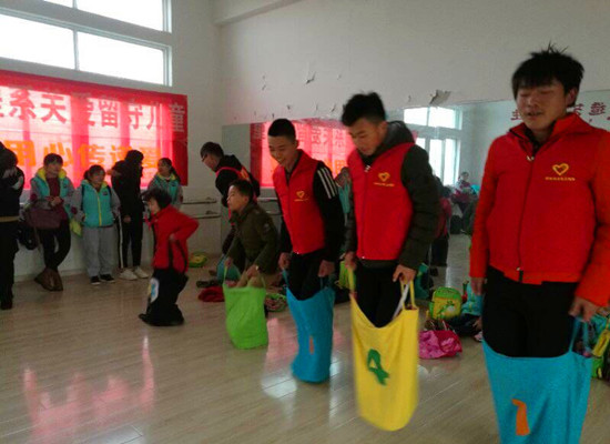 活动一开始留守儿童有些拘谨,在志愿者的指导下,孩子们很快就融入到活动中,并主动展现自已的风采。留守儿童和幼儿园小朋友先后开展了“齐步走”、“口袋跳”、“拔河”等项目。两个小时不知不觉的过去,伙伴们依依不舍,互相道别,伙伴走了但友谊的种子却深深的埋在了心底。今天是周六,留守儿童虽然没有父母的陪伴,但他们不孤单,因为有这么多的叔叔、阿姨、伙伴在关心和爱护着他们;天气虽然很冷,但孩子们的心里暖暖的,因为心中感受到的是一份份火热的爱。