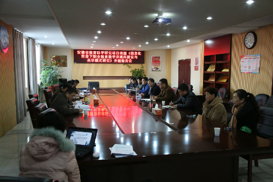 12月11日下午,2017年安徽省教育科研项目课题《信息化背景下职业教育教学资源建设与共享模式研究》开题报告会在安徽滁州技师院(滁州市机电工程学校)综合楼三楼会议室成功举行,课题组全体成员、滁州市教体局专家及滁州职业技术学院专家20余人参加了报告会。