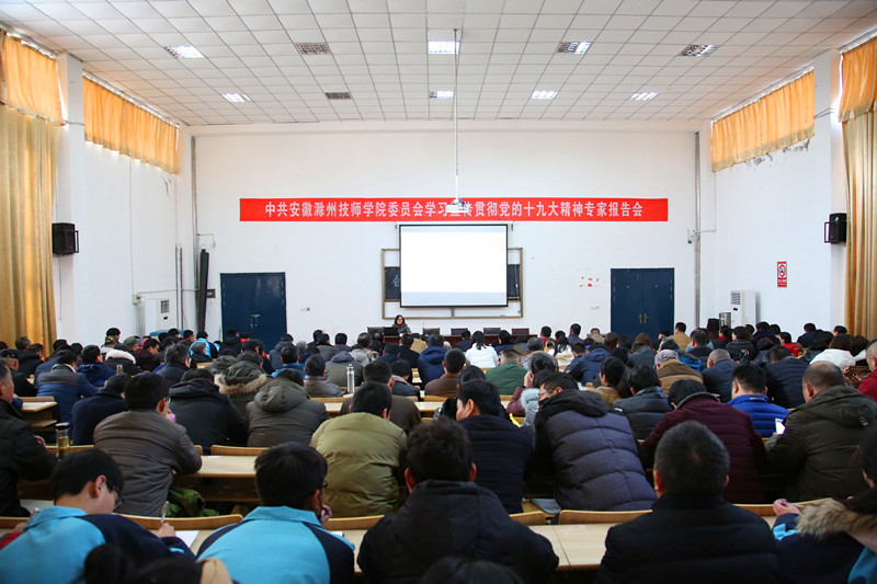 为全面贯彻落实中央、省委、市委关于学习宣传贯彻党的十九大精神的部署和要求,12月20日下午,安徽滁州技师学院举行学习宣传贯彻党的十九大精神专家报告会。院领导汪上、张福兴、湛承鲲、余君琳、潘海波及全体教职工和学生代表300余人参加了报告会。会议由党委副书记、纪委书记张福兴主持。