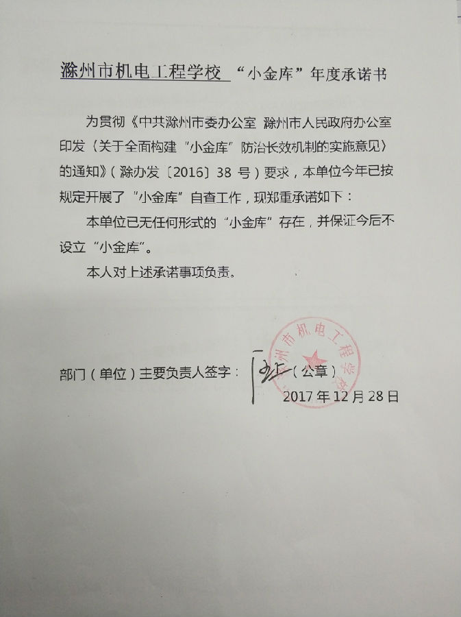 为贯彻《中共滁州市委办公室 滁州市人民政府办公室印发〈关于全面构建“小金库”防治长效机制的实施意见〉的通知》(滁办发〔2016〕38 号)要求,本单位今年已按规定开展了“小金库”自查工作。