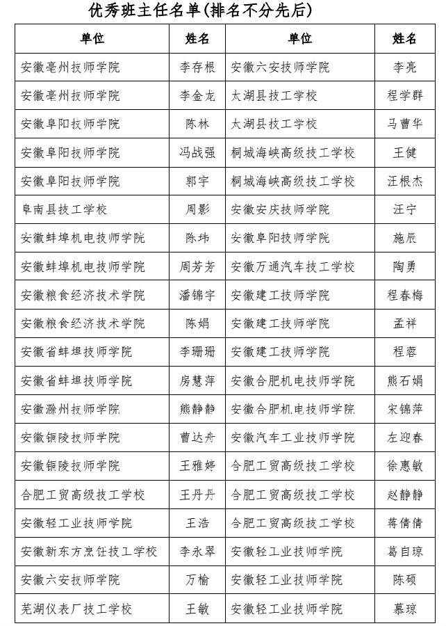 根据《关于开展全省技工院校 2017 年优秀班主任评选活动的通知》(职协字[2017]9 号)精神,经各技工院校评选推荐,地市人社局审核,省职协组织审定,拟授予安徽滁州技师学院机电系熊静静等50名老师为“安徽省技工院校2017年优秀班主任”荣誉称号。