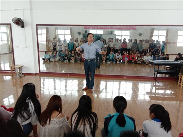我系合唱团首先演唱了《让我们荡起双桨》,后又在余院长的指导并指挥下演唱了《中国共青团团歌》。余院长紧紧抓住同学们的心理特点,对同学们进行放松训练、呼吸训练和声音位置的训练等等。生动幽默的语言、灵活多样的练习方式以及有趣的活动设计让同学们充分感受到了合唱的乐趣。