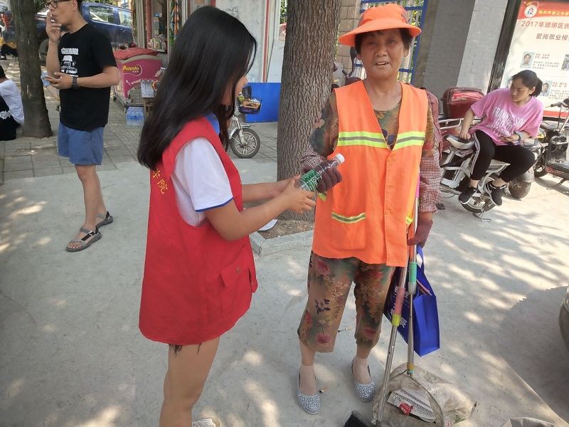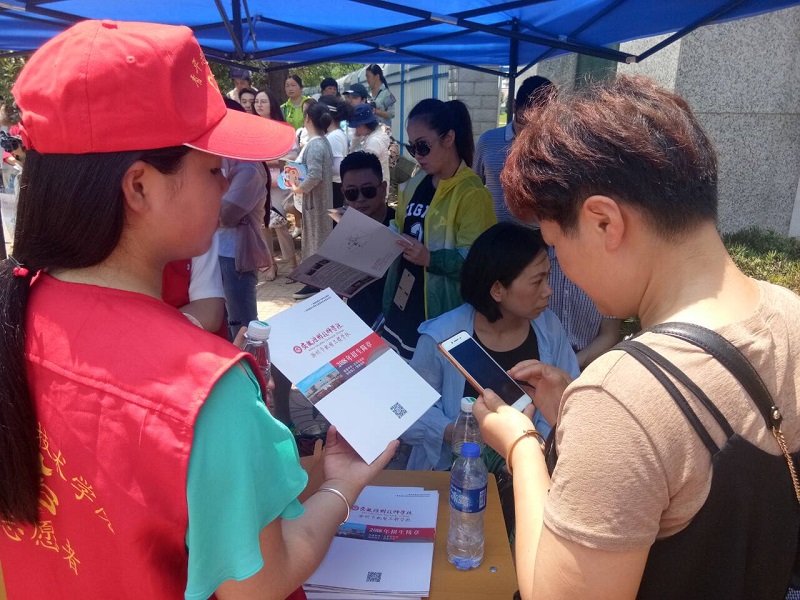 在活动开展前,院团委对志愿者们进行了相关培训,要求志愿者们一定弘扬志愿精神,并树立我院良好形象,志愿服务中,在肖永老师的带领下,我院青年志愿者一边为在考场外等候的家长发放饮用水,一边向学生家长发放我院招生简章,并引导考生家长扫码添加我院微信公众号,了解学院的招生政策、报名须知、各个专业以及丰富的校园文化生活。同时,我院青年志愿者们也为中考服务的环卫工人和指引交通的警察叔叔们送去了矿泉水。