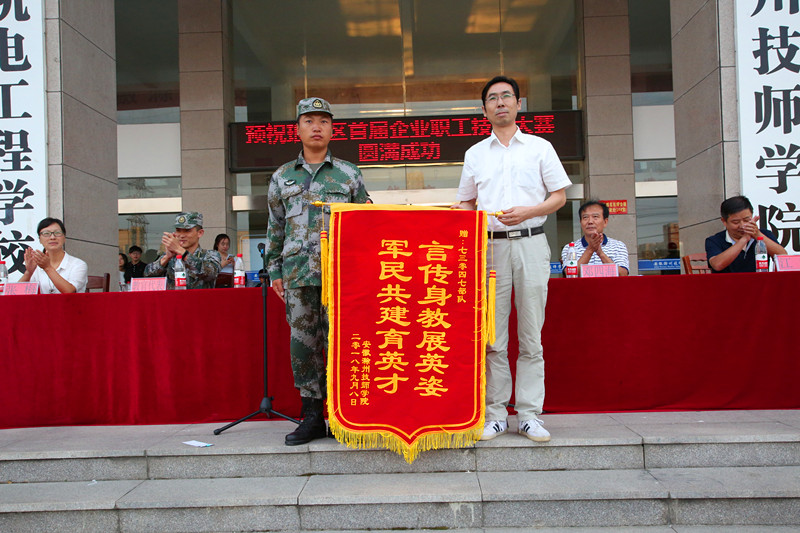 最后,余君琳副校长代表安徽滁州技师学院向中国人民解放军73047部队赠送了锦旗。2018级新生军训闭营式在热烈掌声中圆满结束。