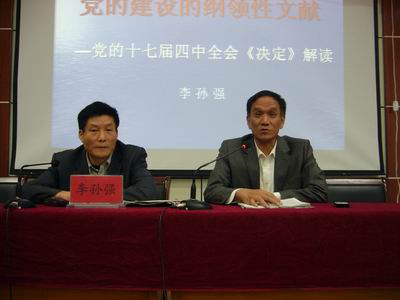 李孙强教授在辅导中结合当前国际、国内政治、经济、军事、文化等方面内容细致地讲解了十七届四中全会的具体要求和重大意义。李教授深入浅出、精彩的辅导赢得了一次次热烈的掌声。