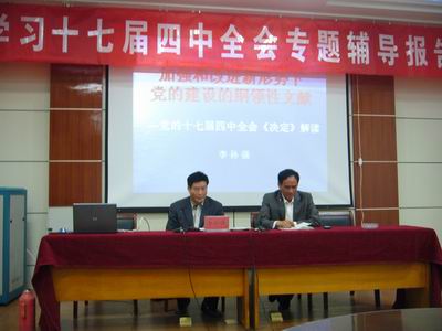 为深入推进我校学习实践科学发展观活动,切实提高全体党员干部的思想政治水平,10月27日下午,特邀滁州市委党校李孙强教授来我校做学习十七届四中全会专题辅导报告,学校全体党员干部、入党积极分子参加了此次专题辅导报告。
