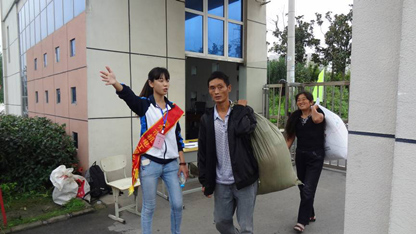 学生志愿者在校团委的组织安排下,分赴车站、校园多个接待点迎接新同学。不论是在校门口,还是在食堂、教学楼、宿舍楼,都可以见到学生干部忙碌的身影,为新来的同学带路,帮他们提行李,带领他们熟悉环境。