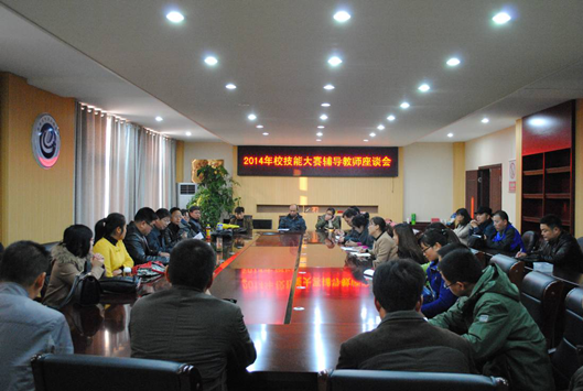 11月19日下午,我校召开2014年校技能大赛教师座谈会,校级班子成员,办公室、教导处、教研室、学生处主要负责人,教研组长,实训中心负责人,2014年省赛一等奖、国赛三等奖辅导教师,本学年度技能大赛全体辅导教师共50余人参加了会议,会议由吴大明校长主持。