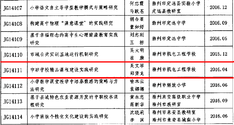 经省教育科学规划领导小组办公室组织有关专家评审、社会公示和省教育科学规划领导小组、省教育厅审查批准,全省1255项申报课题中的367项被确定为2014年度省教育科学规划立项课题。其中,我校申报的《市域公共实训基地运行机制研究》和《中职学校精品课程建设实践研究》两项课题被确立为2014年度安徽省教育科学规划立项课题。
