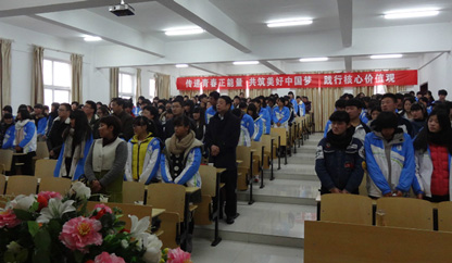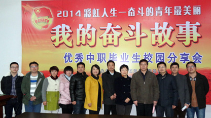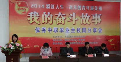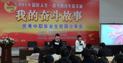 为进一步培育和践行社会主义核心价值观,为青年学生树立可亲、可敬、可学的榜样,激励广大青年学生刻苦学习、奋发成才,引导他们更好地为建设滁州奉献力量。12月22日下午,由共青团滁州市委员会主办,共青团滁州市机电工程学校委员会承办的“2014彩虹人生”优秀中职毕业生校园分享会——“奋斗的青春最美丽”在我校成功举办。团市委书记孙枝娟、团市委副书记鲁凯、团市委青农部部长栗彦东、学少部部长王睿及我校吴大明校长、邹全胜副书记亲临会场,与我校300多名学生代表一同聆听了4位优秀青年代表的奋斗故事与青春感悟,活动由校团委书记秦静主持。