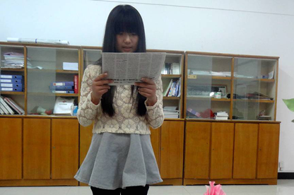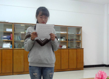 整个招新活动分为自我介绍与基本素质考核两部分,每位进入考核的同学,需要现场做一番自我介绍,然后对随机抽取的新闻与散文诗进行朗读,应聘记者编辑的同学需要仔细观察现场情形,写好新闻稿,并现场按照要求编说故事。经过两轮的初选之后,共有24位同学进入复试。