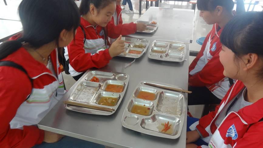 就餐的同学们自觉做光盘一族,自信展示吃完的光盘