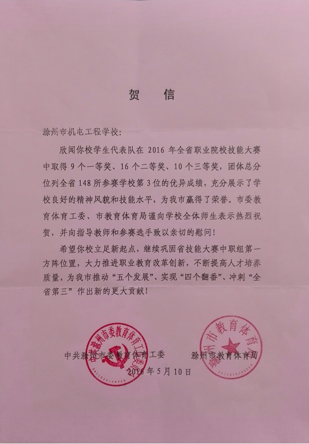 在2016年安徽省中职学校技能大赛中,我校参赛选手不畏强手,沉着应战,奋力拼搏,不负众望,一举夺得了9个一等奖、16个二等奖、10个三等奖的优异成绩,团体总分在全省148所参赛学校中排名第3位,位居滁州市第一。