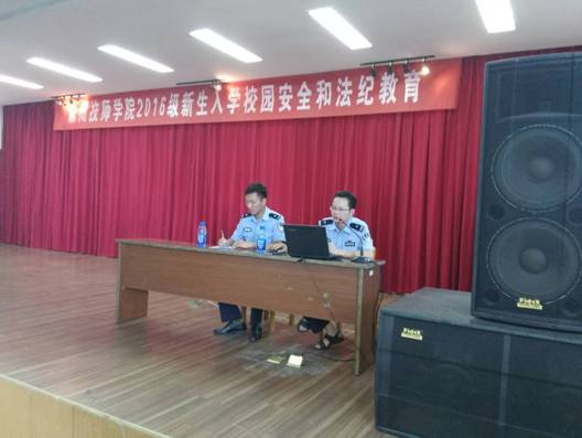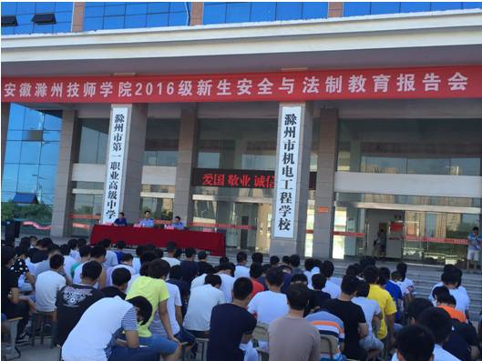 为更好的传达贯彻学院领导对校园安全工作的要求,推进平安校园建设,根据学院新手入学教育工作的安排,我校南、北两校区于8月24、25日同时举行由新生班级全体师生参加的一场“安徽滁州技师学院2016级新生入学安全和法制教育专题报告会”。
