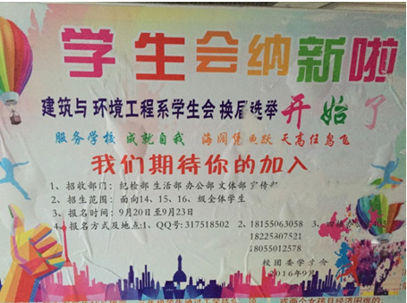 在本次招新中,充分体现了建筑与环境工程系同学们昂扬的士气,严肃认真的工作态度,积极进取的工作要求,相信建筑与环境工程系注入这青春的血液和活力,建筑与环境工程系的明天会更好。