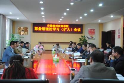 10月12日下午,安徽滁州技师学院召开筹备组理论学习(扩大)会议。滁州职业技术学院副院长、安徽滁州技师学院筹备组副组长汪上、筹备组成员张福兴、湛承鲲、潘海波、各职能处室、系部负责人和相关党务工作者参加了会议。会议由张福兴主持。