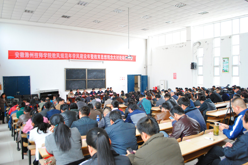 4月5日下午,安徽滁州技师学院在教学楼召开教风规范年学风建设年暨教育思想观念大讨论动员大会,会议旨在全面部署2017年“教风规范年学风建设年”活动,营造“教师爱教、学生乐学”的优良教风学风,进一步提高教育教学水平和人才培养质量,为实现“特色鲜明、国家示范性技师学院”奠定坚实基础。滁州职业技术学院党委副书记、纪委书记刘树俭、滁州职业技术学院党委委员、副院长、安徽滁州技师学院党委书记、院长汪上、滁州职业技术学院党委委员、组织人事处处长陈学军、安徽滁州技师学院党委副书记、纪委书记张福兴、党委委员、副院长湛承鲲、余君琳、潘海波及全院教职工参加了会议。会议由张福兴主持。