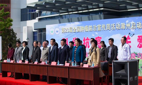 副市长陆峰、市卫计委主任张文金、市一院院长刘家珍、市癌症康复协会会长朱静在启动仪式上分别讲话。启动仪式前,在东门广场肿瘤防治免费义诊活动上,专家耐心细致地解答患者,学院志愿者们认真维持患者排队秩序。来自滁州癌症康复协会的200多位癌症患者在现场表演了大型手语舞。