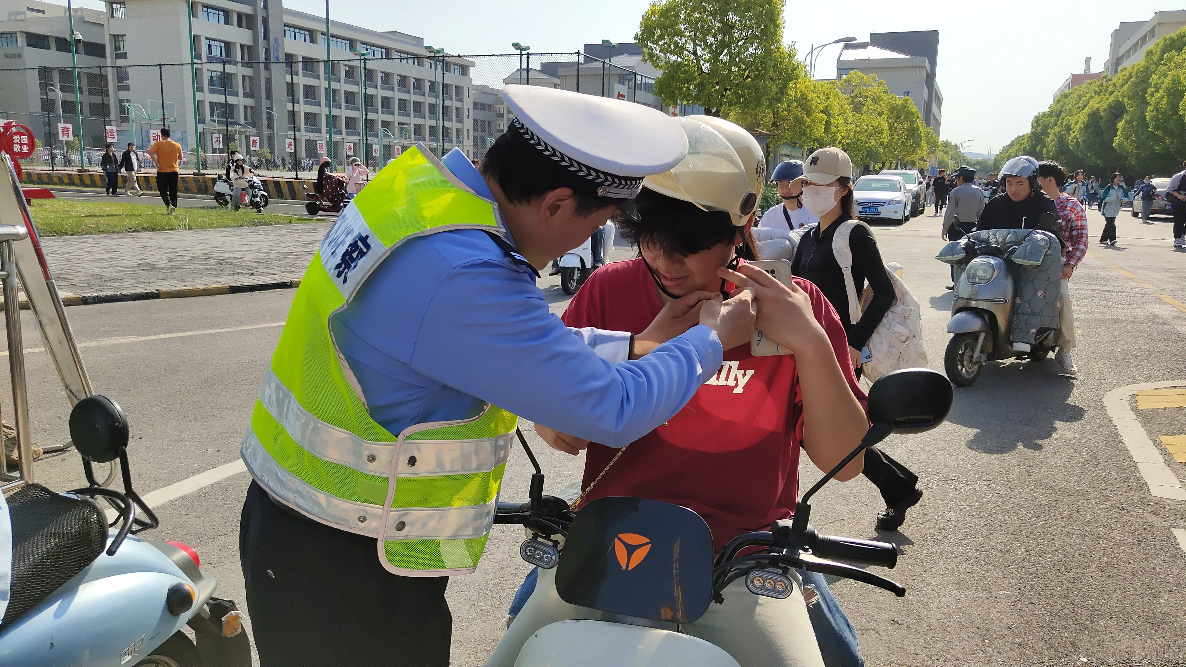 会后,郑警官在放学期间,现场对学生指导怎样正确佩戴头盔。