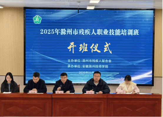 11月18日上午,2025年滁州市残疾人职业技能培训班开班仪式在我校顺利举行。本次培训由滁州市残联与我校共同举办,旨在通过政校协同提升残疾人职业技能,带动残疾人就业创业。市残联有关负责同志殷乃建、胡雪莹,滁州技师学院党委委员、副校长施亮出席仪式。校实训中心负责人李志俊主持仪式,全体学员及工作人员参加活动。