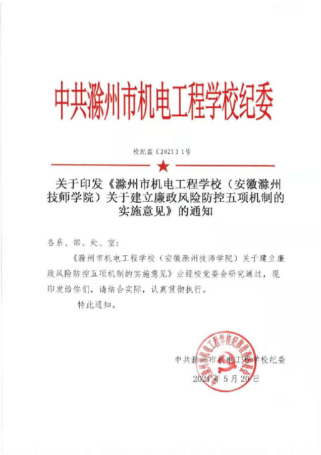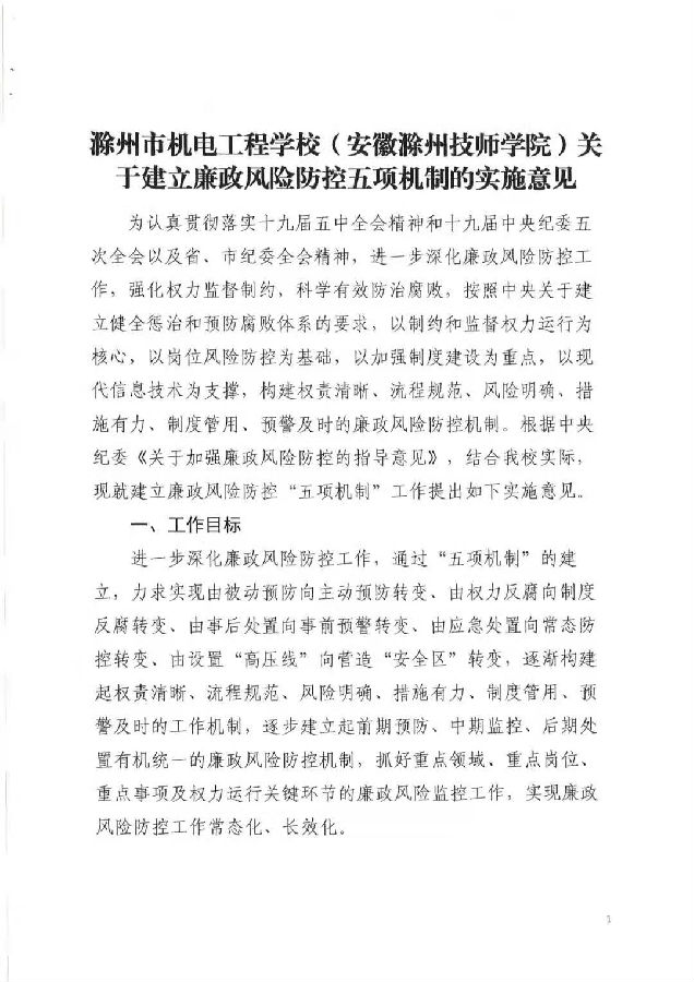 安徽滁州技师学院(滁州市机电工程学校)关于建立廉政风险防控五项机制的实施意见