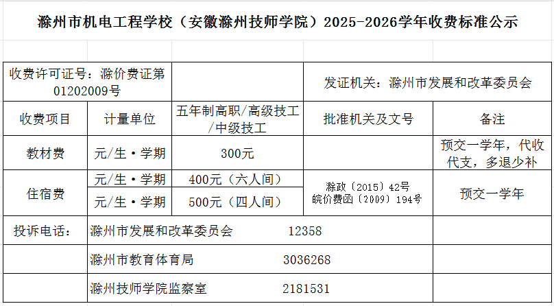 滁州市机电工程学校(安徽滁州技师学院)2025-2026学年收费标准公示