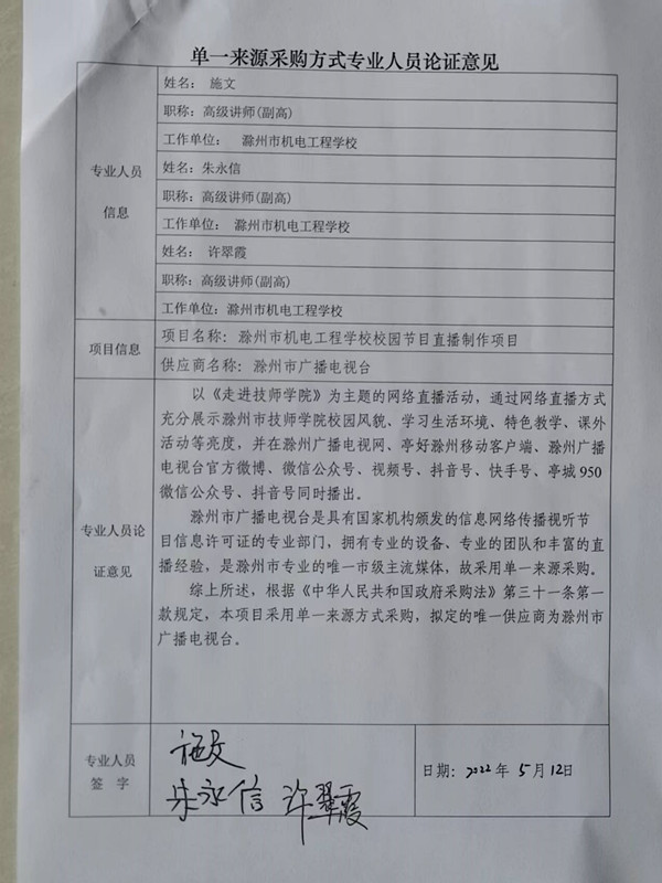 滁州市机电工程学校校园节目直播制作项目单一来源采购公示
