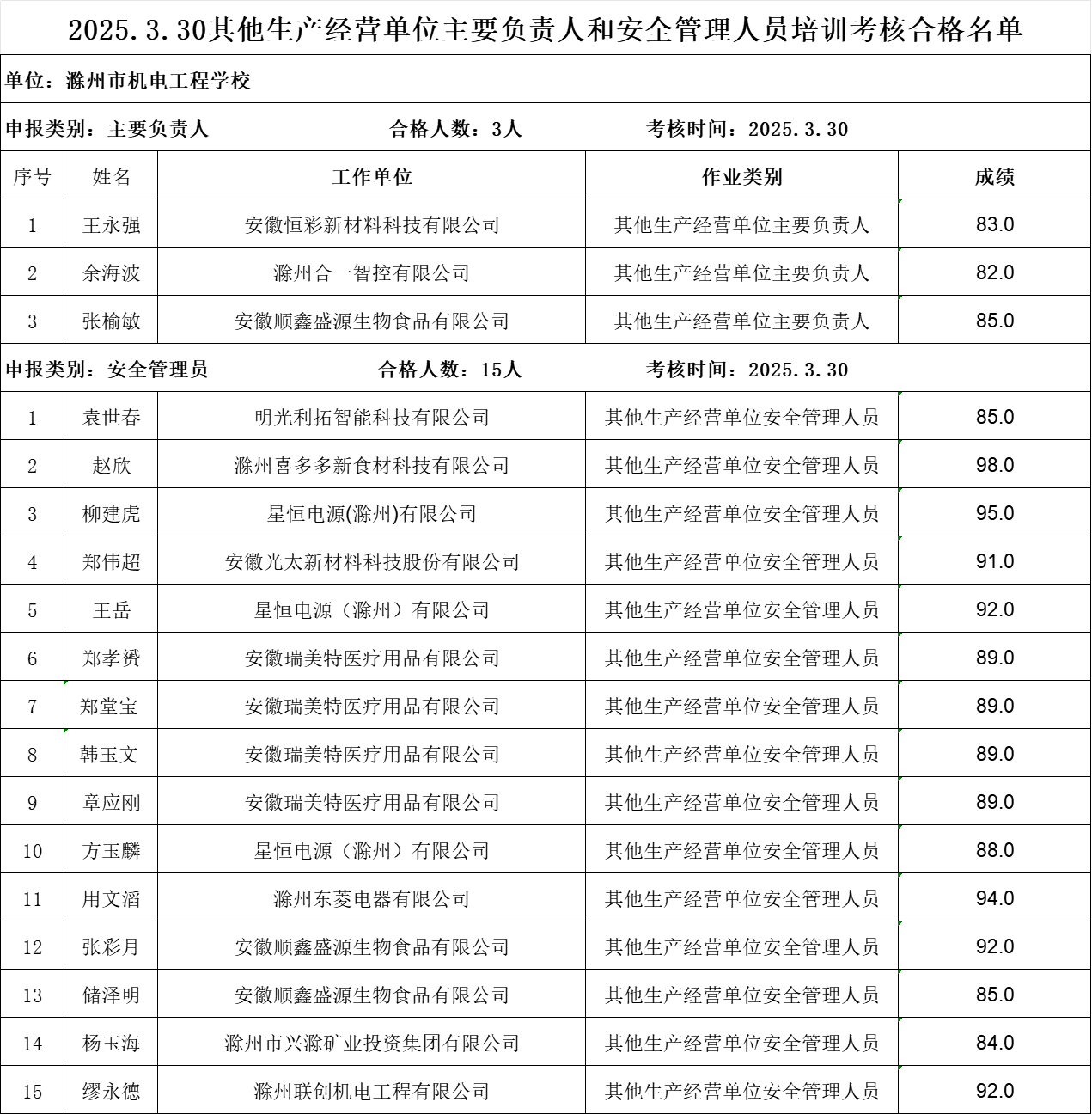 2025年3月30日 其他生产经营单位主要负责人和安全管理人员培训考核合格名单